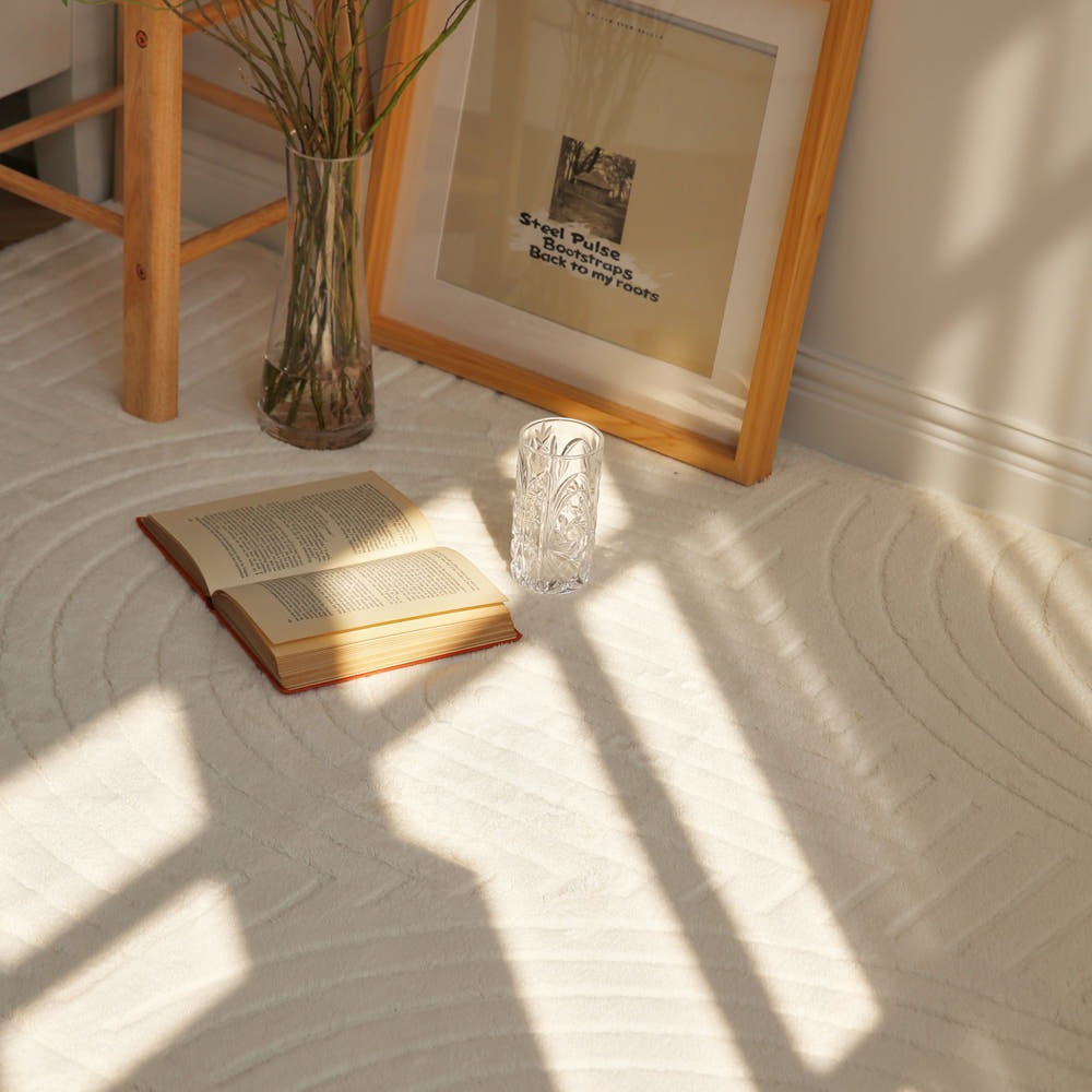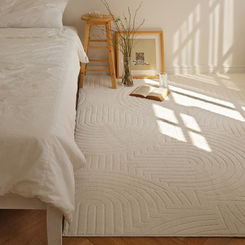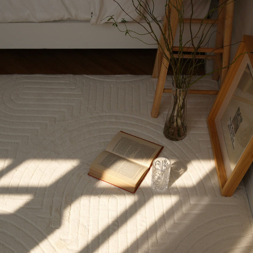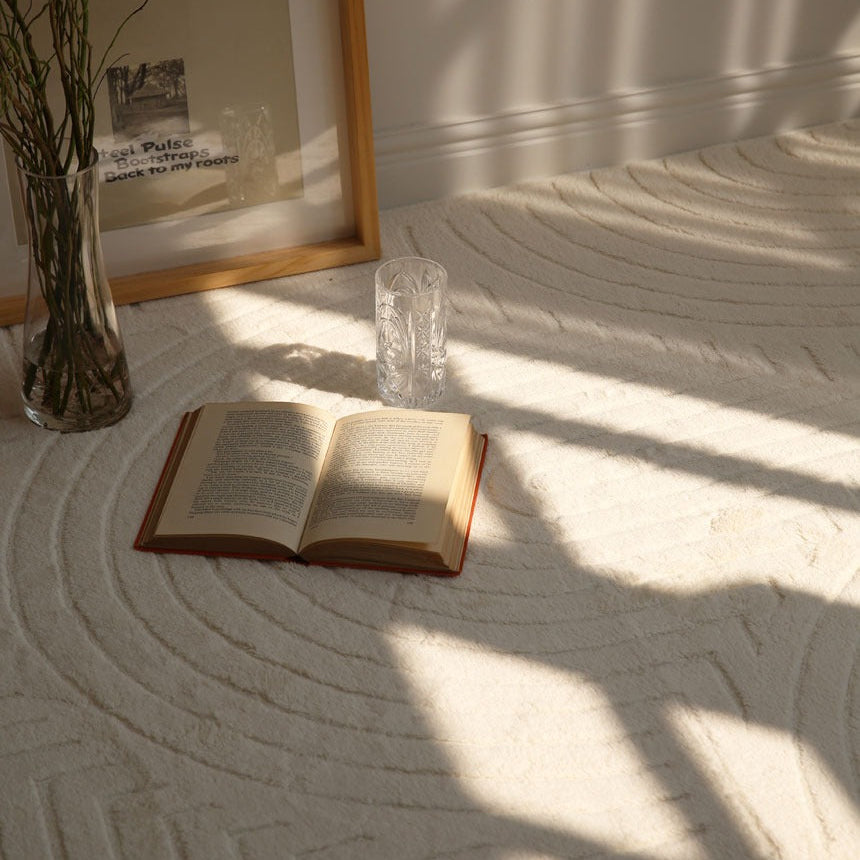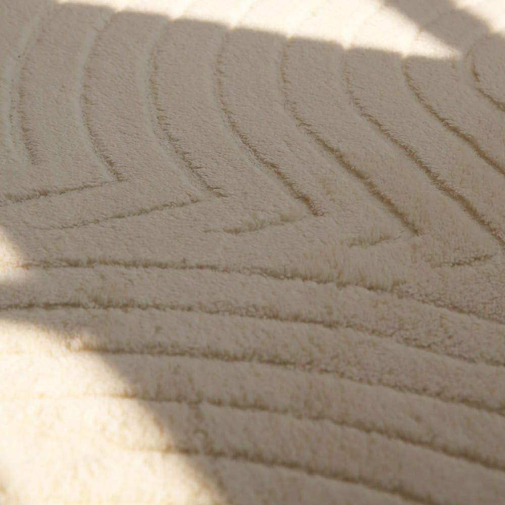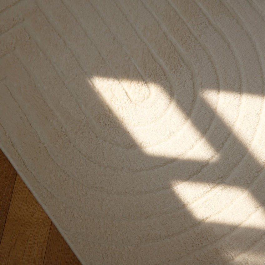 温かみのあるアイボリーカラーの上に、曲線と直線が調和したデザインラグです。