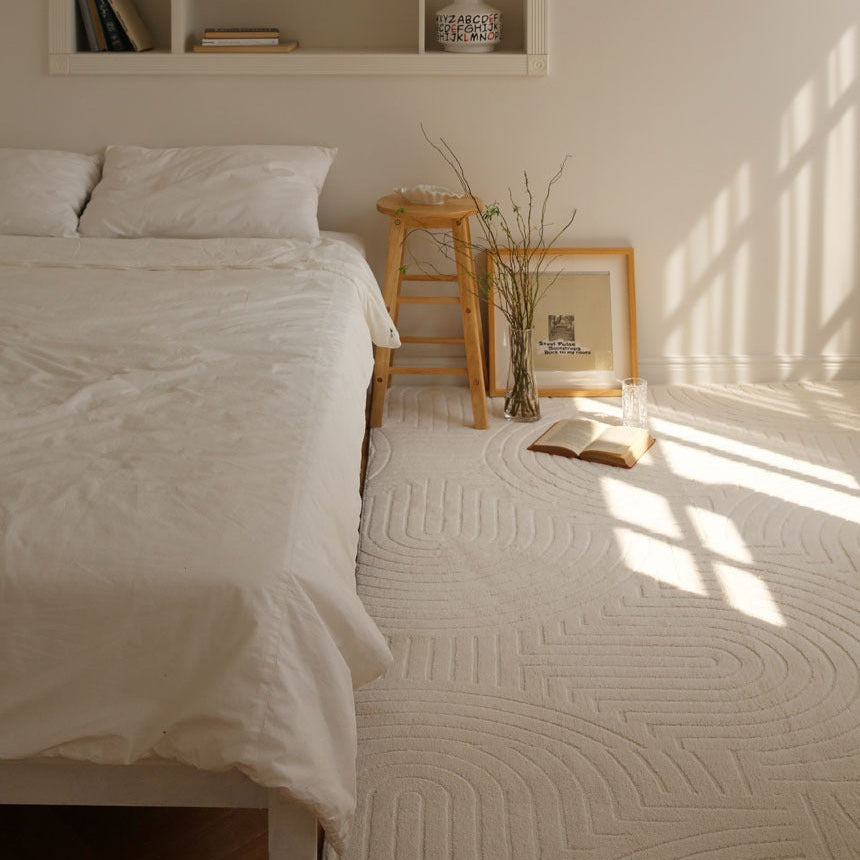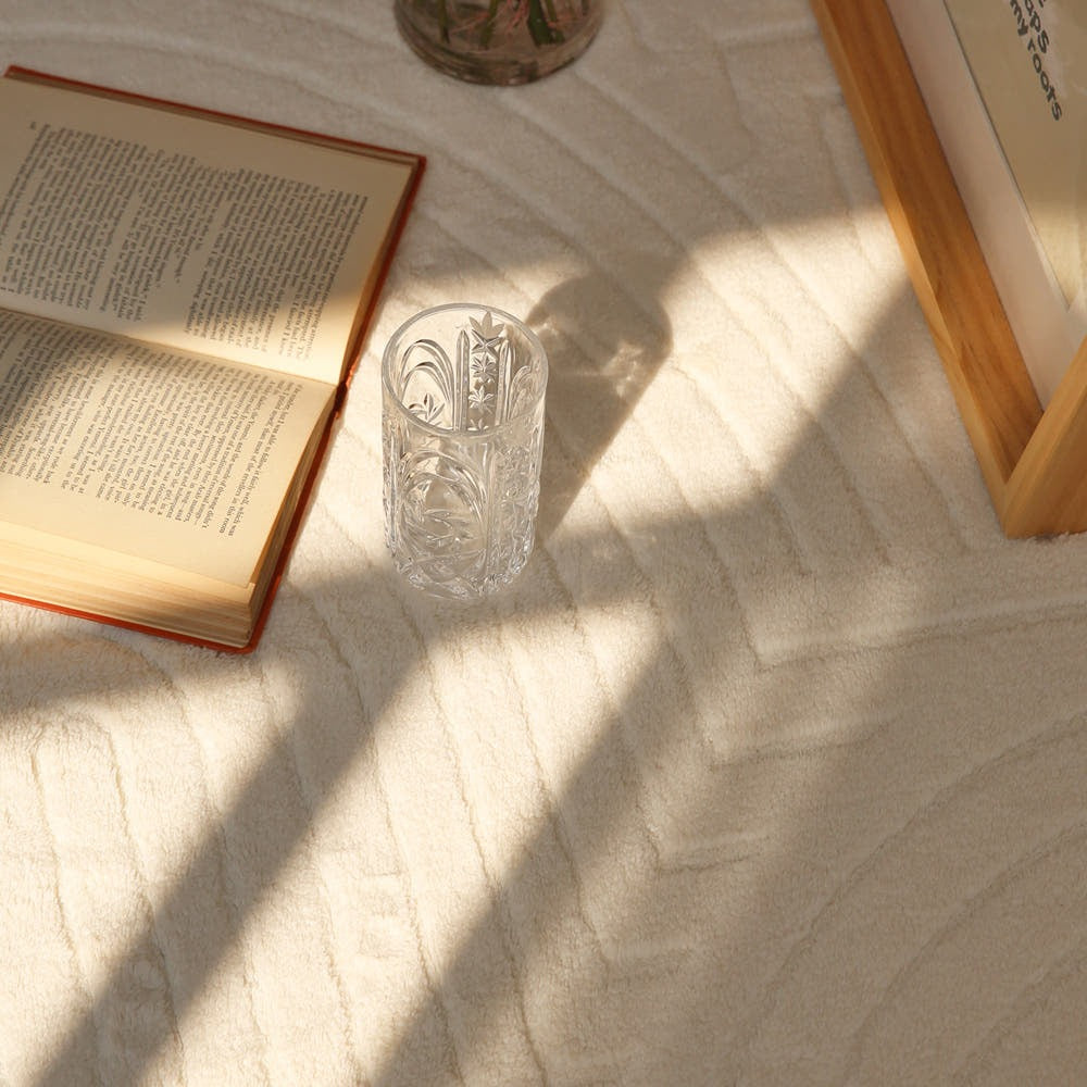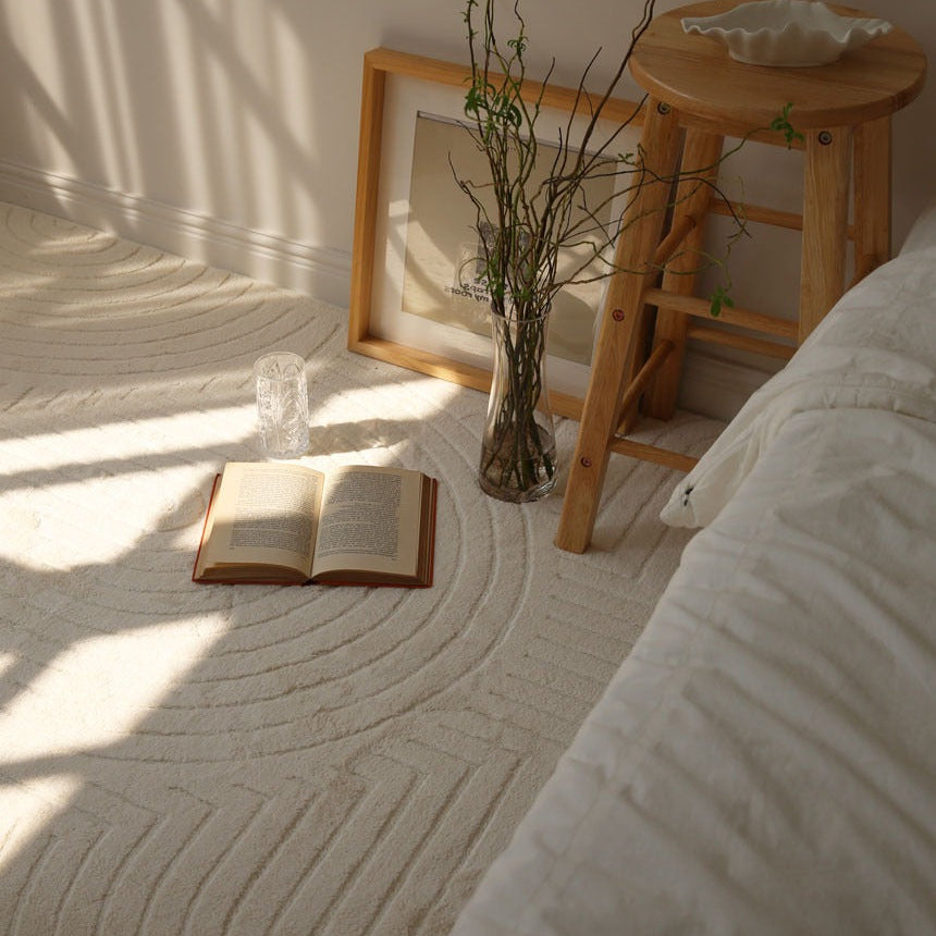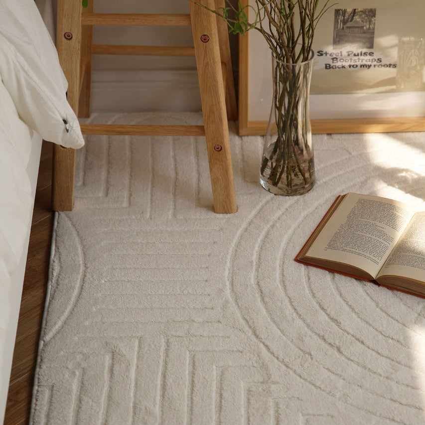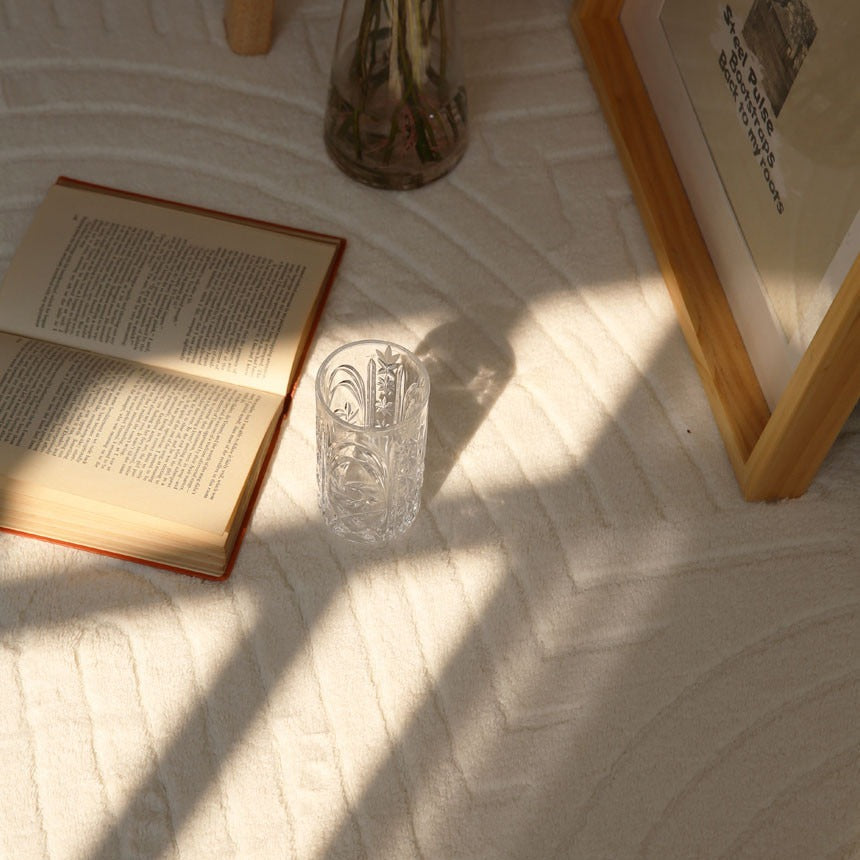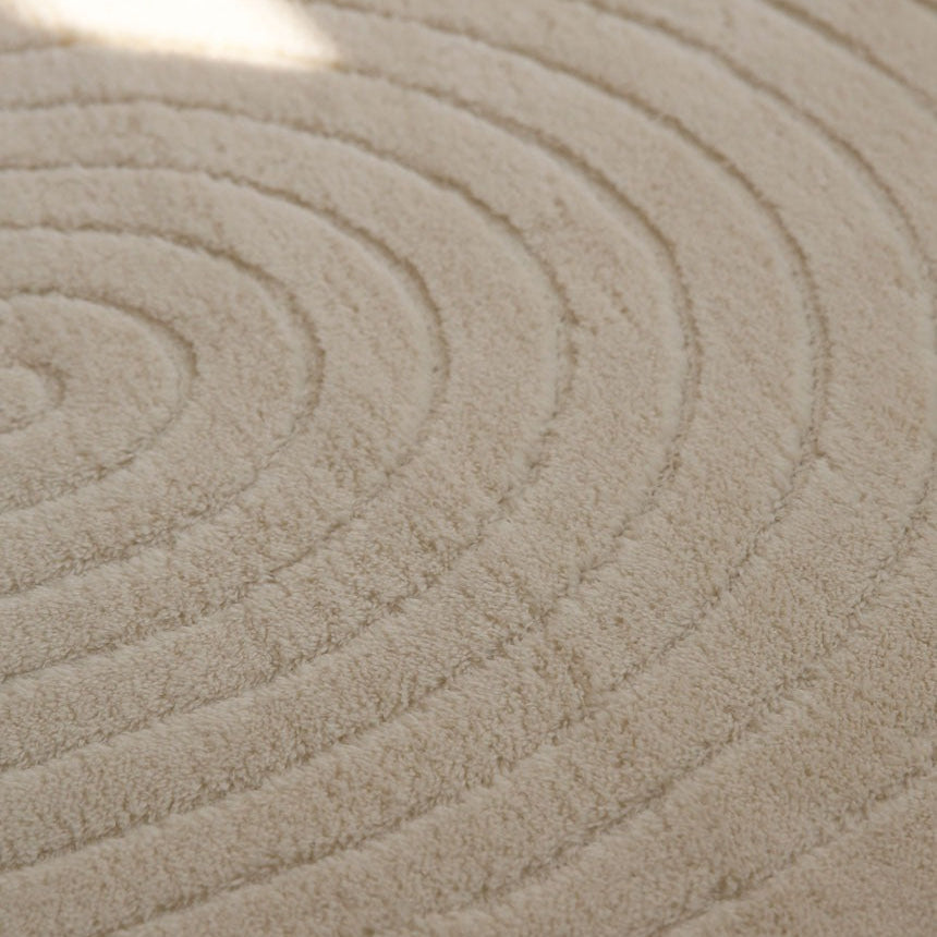 温かみのあるアイボリーカラーの上に、曲線と直線が調和したデザインラグです。