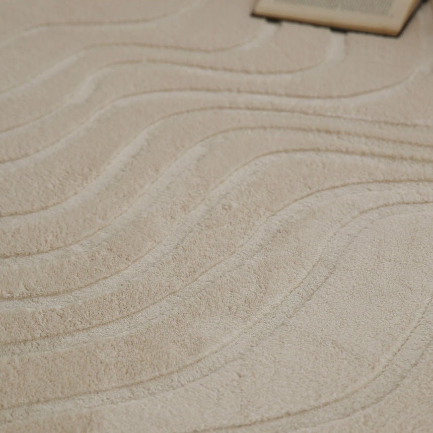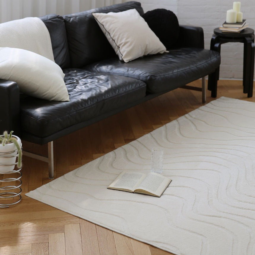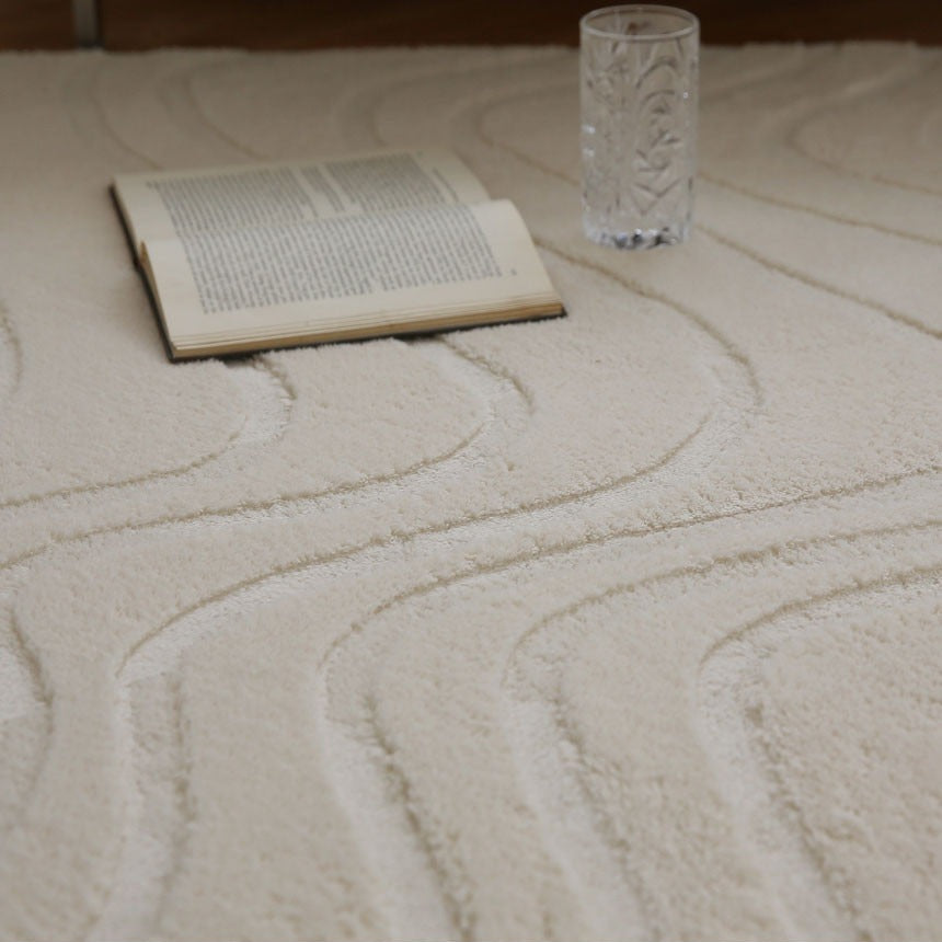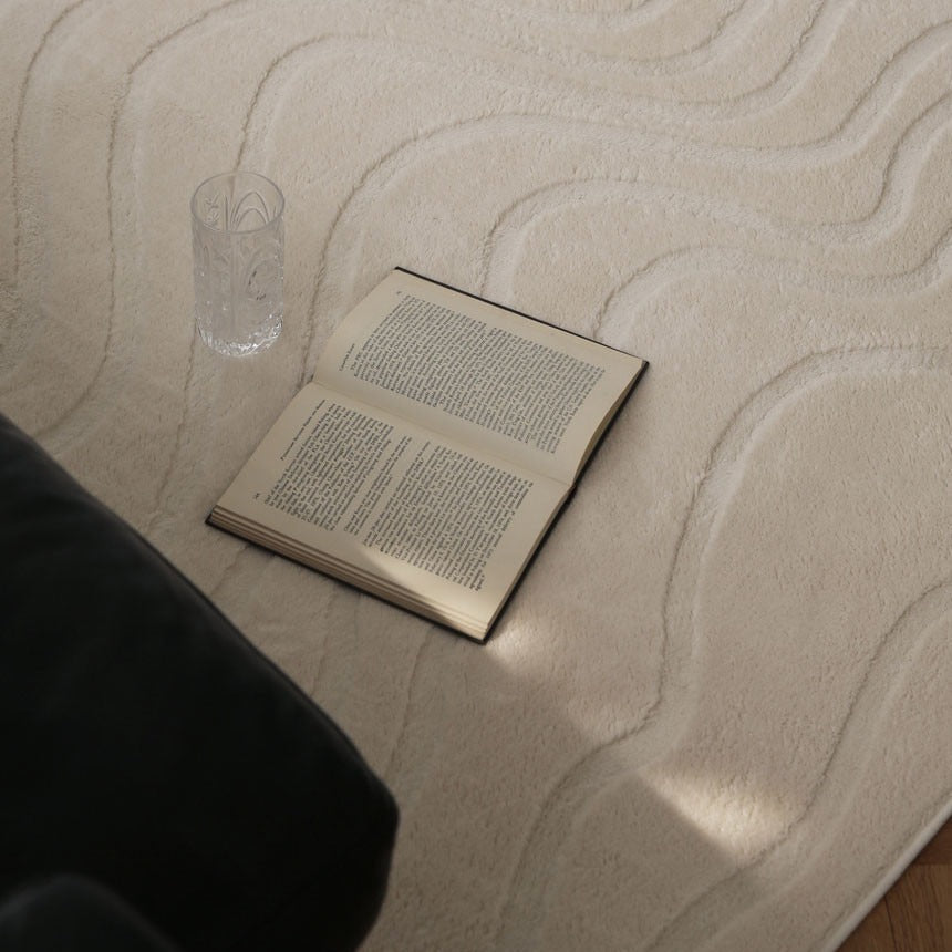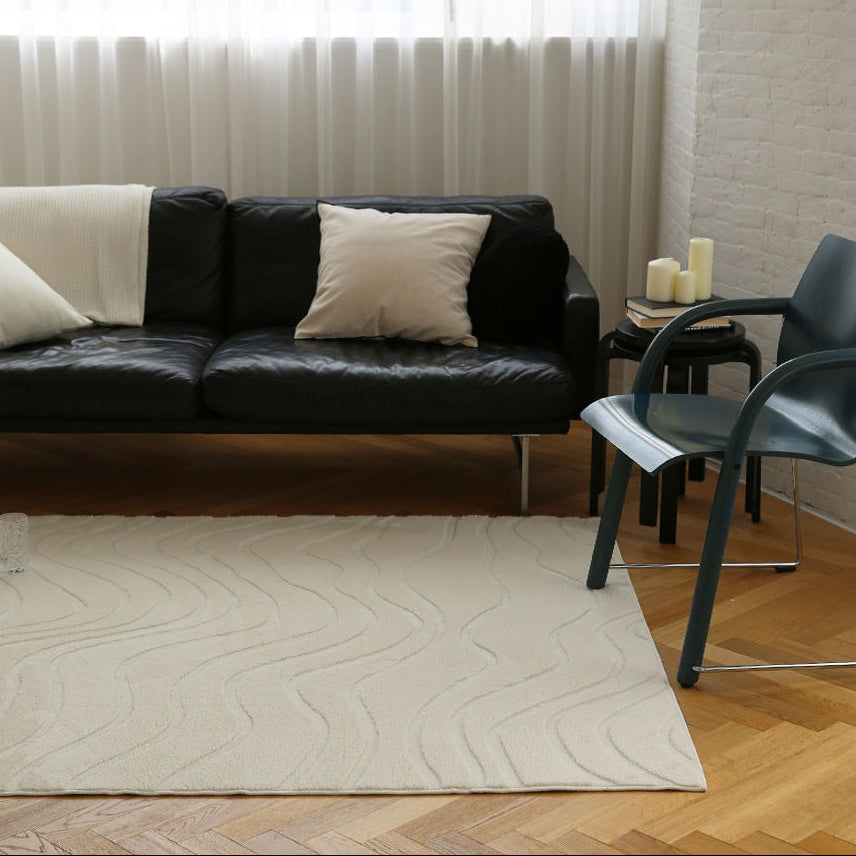 温かみのあるアイボリーカラーに、水の流れのように柔らかく流れる曲線パターンが描かれたデザインラグです。