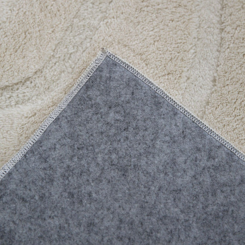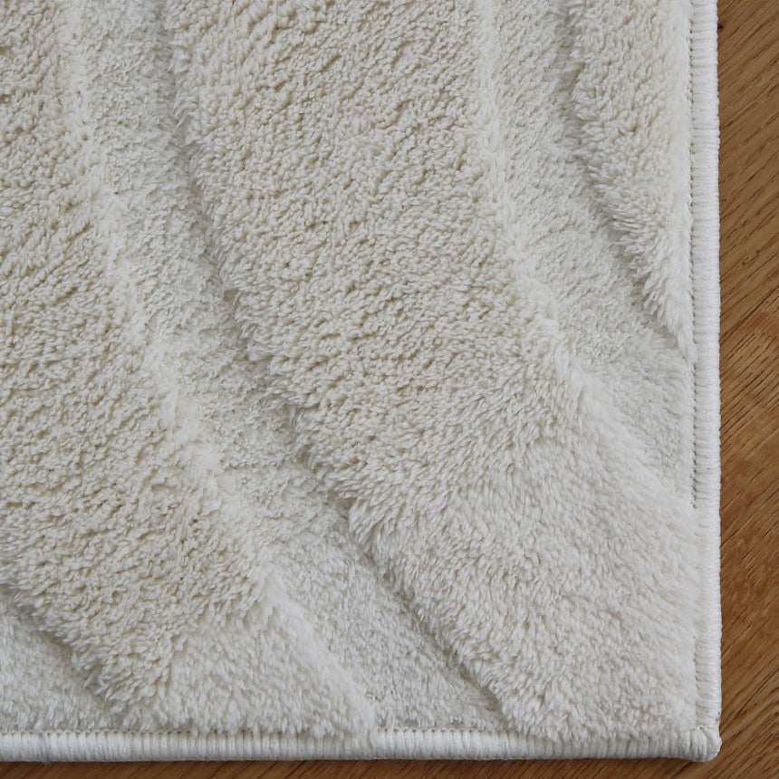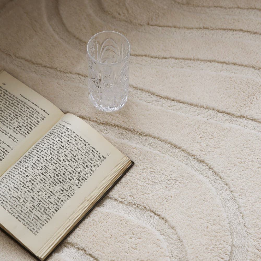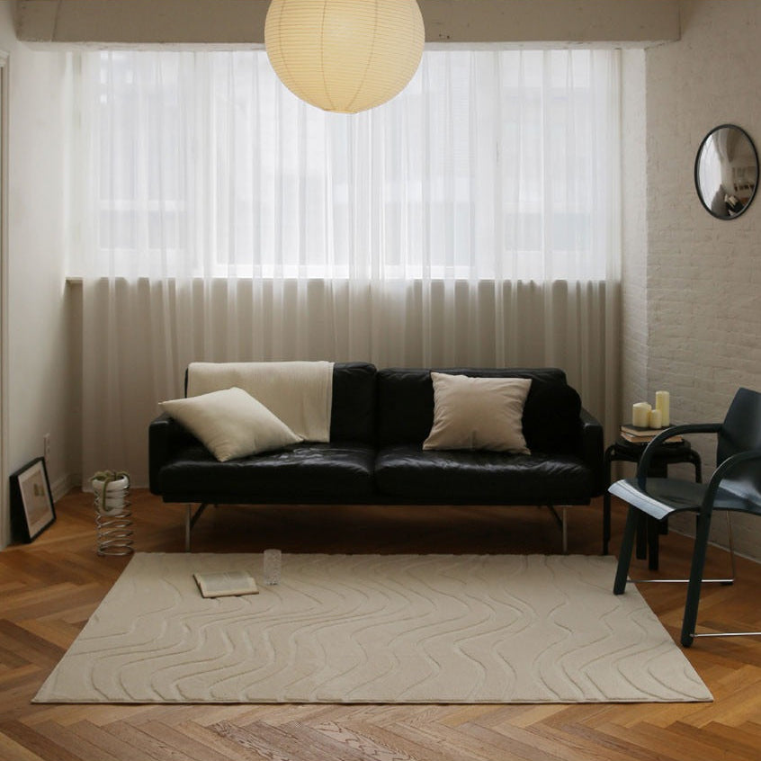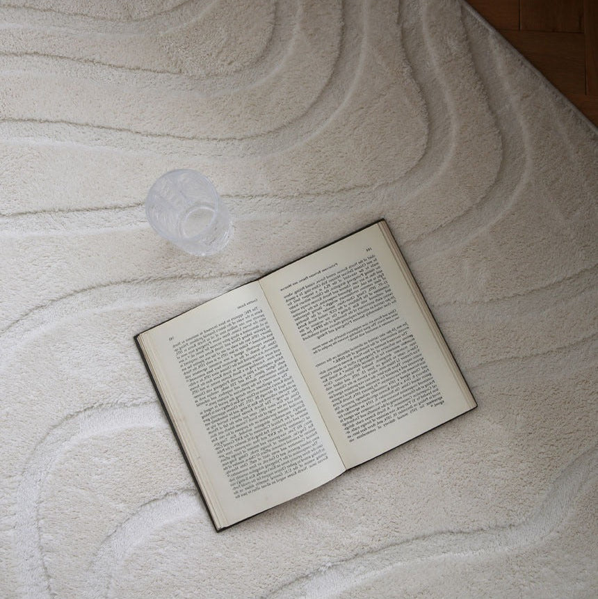 温かみのあるアイボリーカラーに、水の流れのように柔らかく流れる曲線パターンが描かれたデザインラグです。