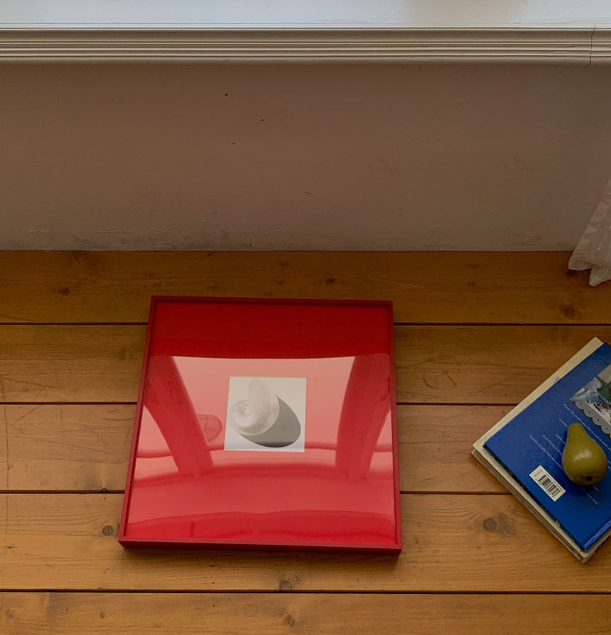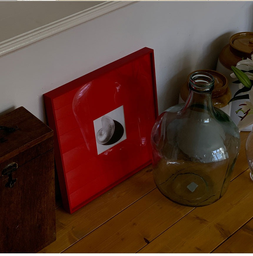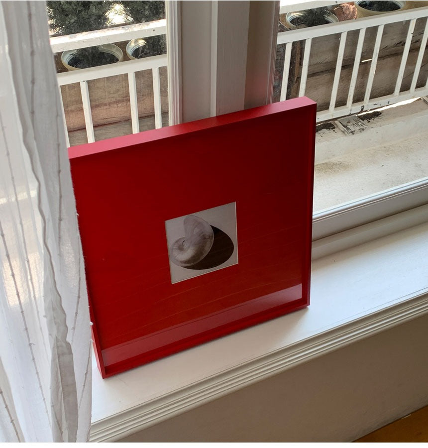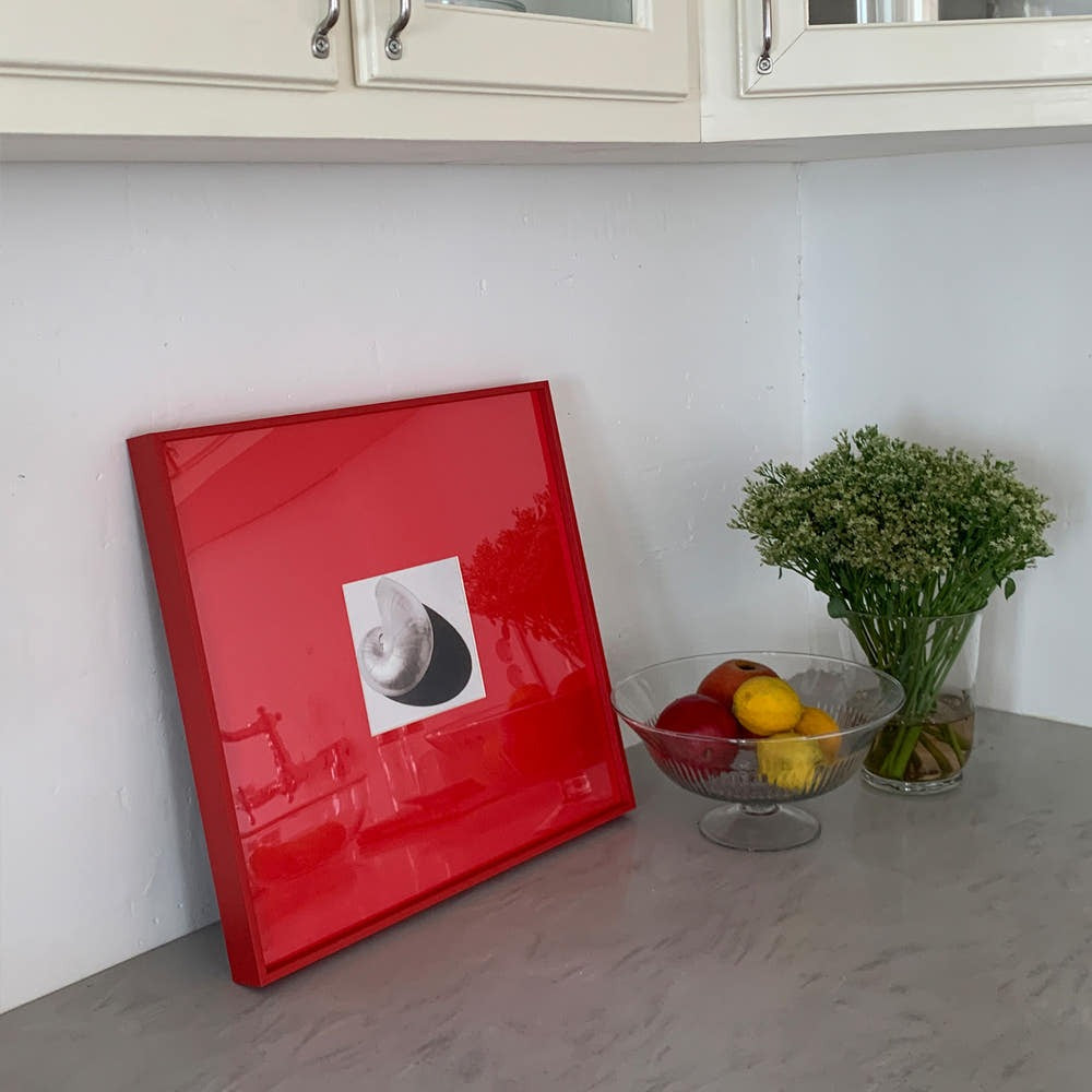 深みのあるレッドカラーのフレームに、ミニマルなオブジェが映えるデザインで、