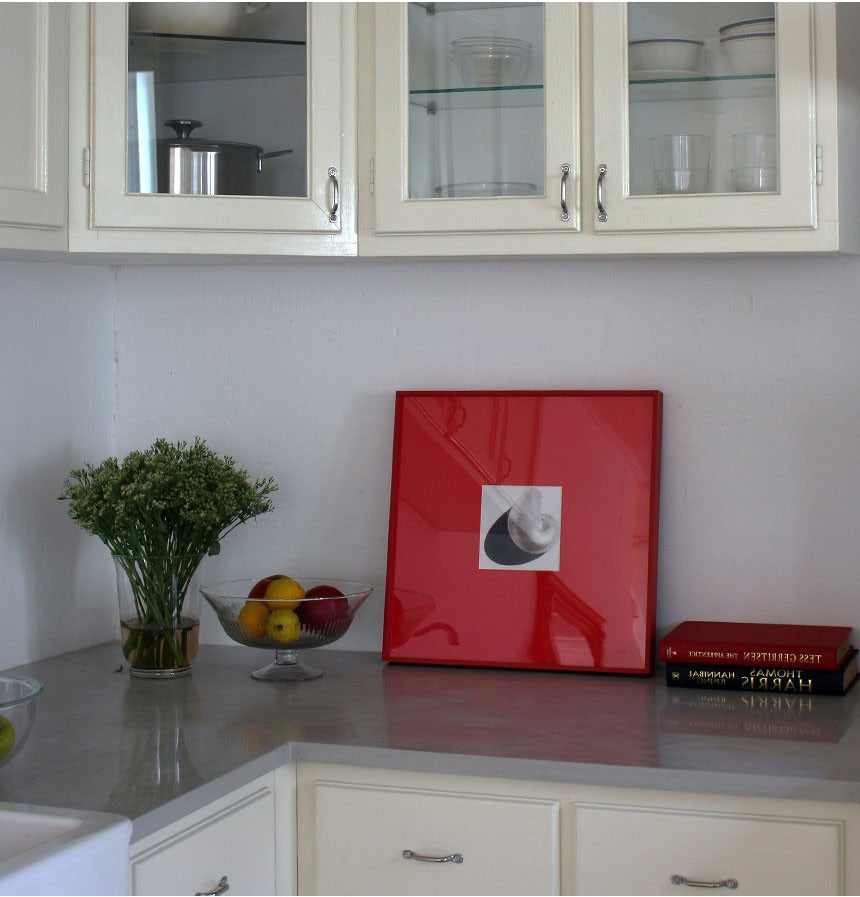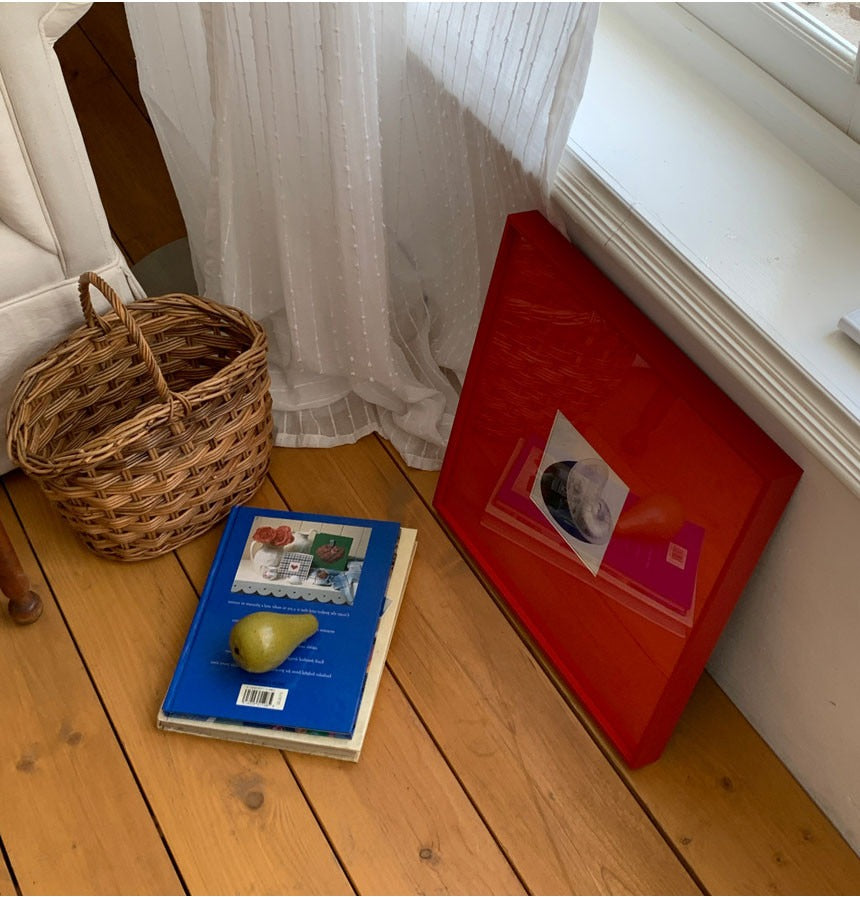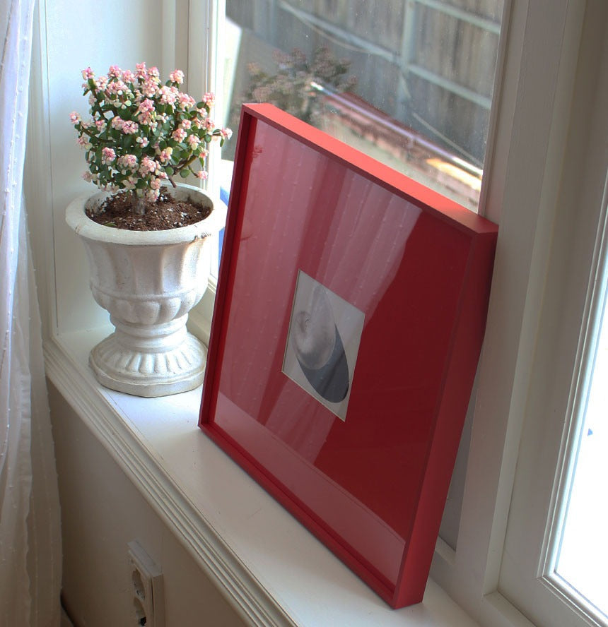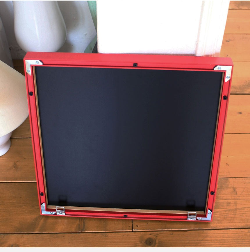 深みのあるレッドカラーのフレームに、ミニマルなオブジェが映えるデザインで、
