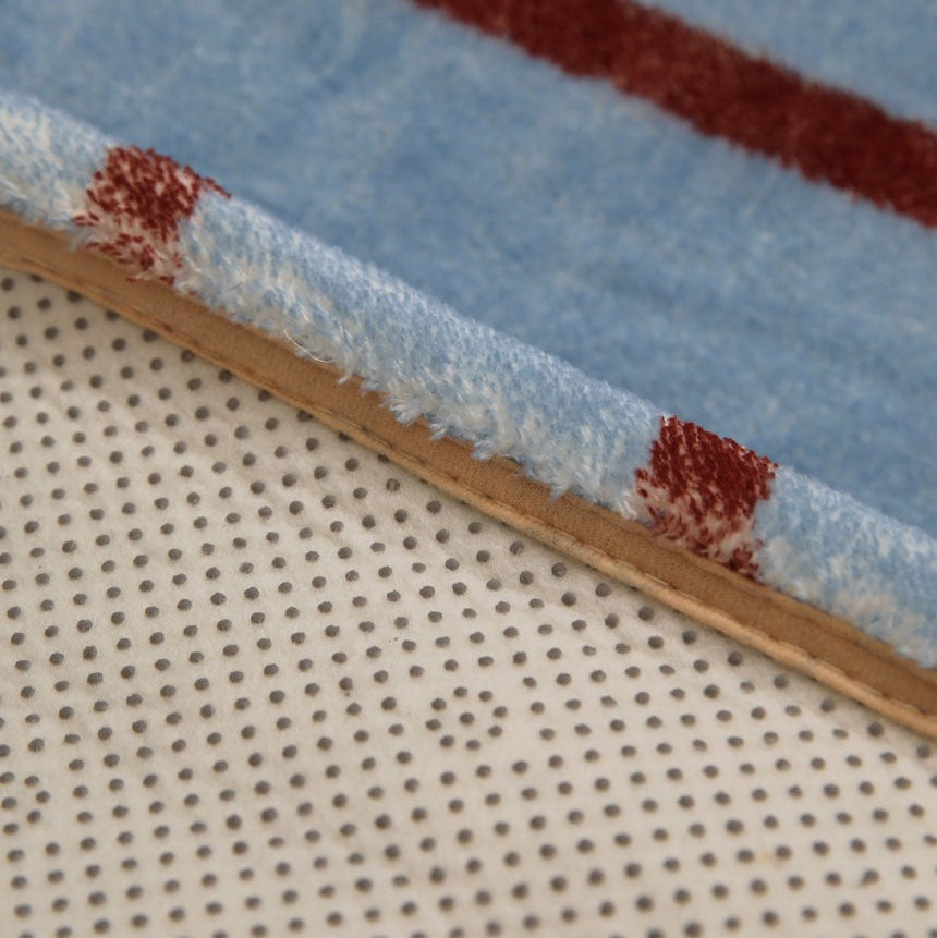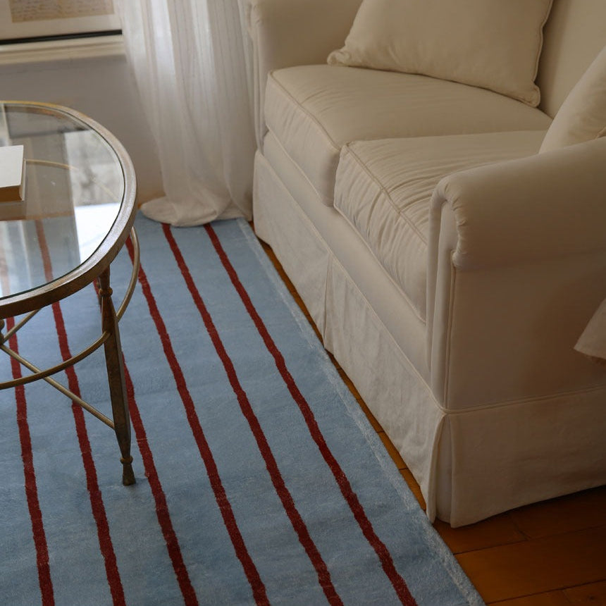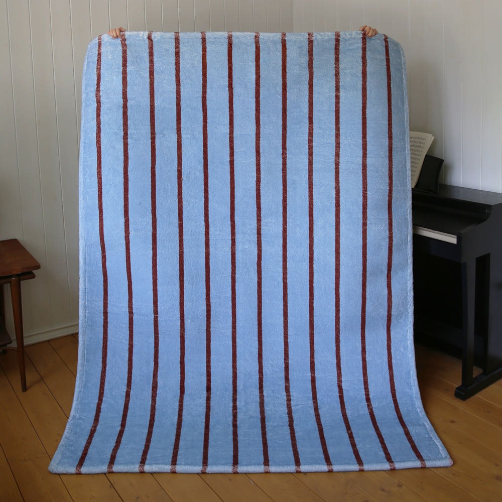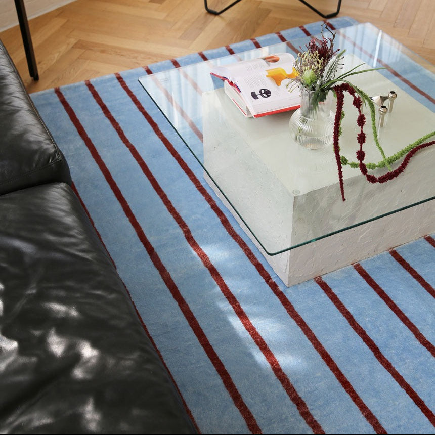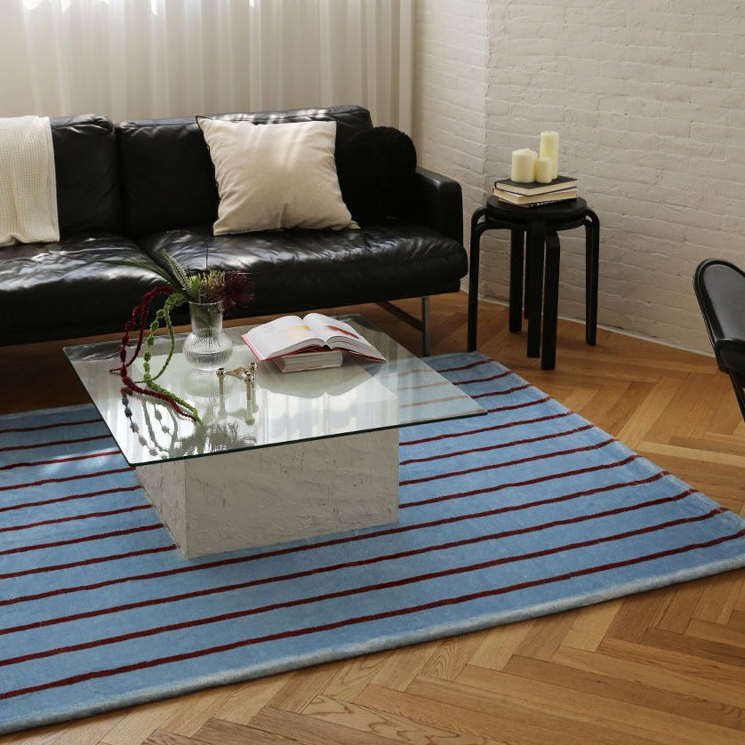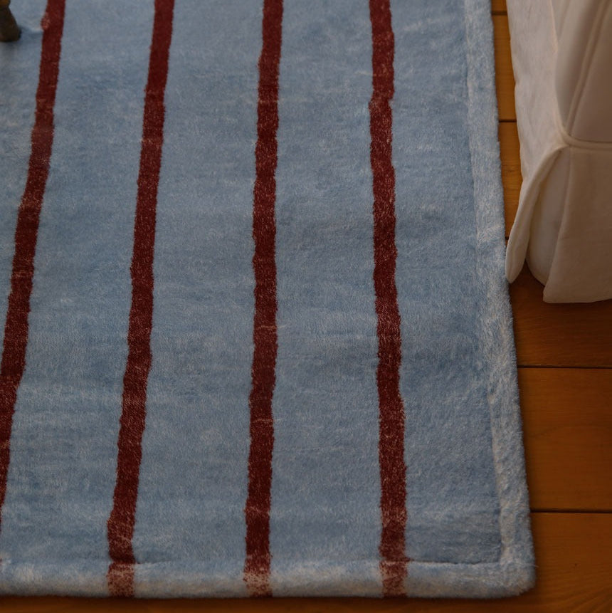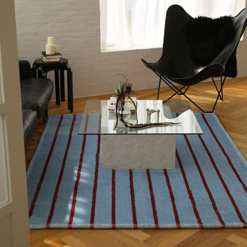落ち着いたブルートーンの上に、深みのあるレッドストライプを重ねたラグです。
