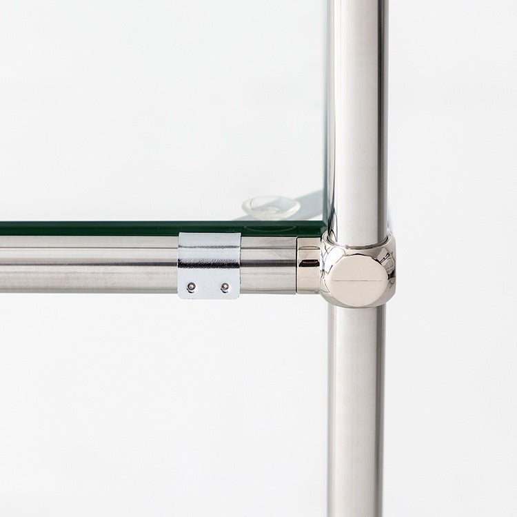 透明感のある強化ガラスと、クロームメッキ仕上げのスチールフレームを組み合わせることで、
