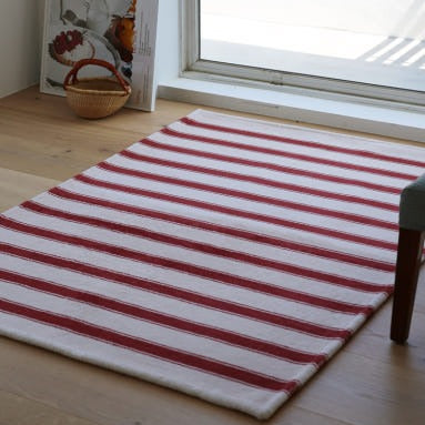 レッドカラーのストライプパターンが特徴のデザインラグ。